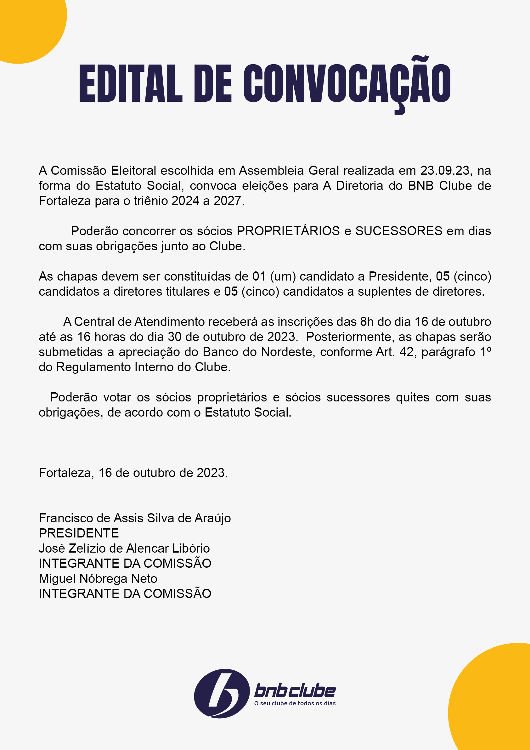 Início BNB Clube Edital de Convocação – Eleições para a Diretoria do BNB Clube BNB Clube Edital de Convocação – Eleições para a Diretoria do BNB Clube Por Brenda Bezerra Lima - 20 de outubro de 2023 512 0 FacebookTwitterPinterestWhatsApp A Comissão Eleitoral escolhida em Assembleia Geral realizada em 23.09.23, na forma do Estatuto Social, convoca eleições para a Diretoria do BNB Clube de Fortaleza para o triênio 2024 a 2027. ARTIGOS RELACIONADOSMais do autor BNB Clube BNB Clube encerra temporada 2025 com destaque na etapa final do Circuito Brasileiro de Vôlei de Praia em Fortaleza BNB Clube CBVP Fortaleza: BNB Clube disputa etapa final com força total no Marina Park BNB Clube Elite 16 Itapema: Thainara Oliveira fecha etapa em 4º lugar Mais Populares BNB Clube é destaque no Campeonato Piauiense de Atletismo 4 de maio de 2021 Dia dos Pais no BNB Clube 2 de agosto de 2019 BNB Clube de Fortaleza-CE foi quem dominou o Vôlei de Praia... 20 de janeiro de 2022 Recentes BNB Clube encerra temporada 2025 com destaque na etapa final do Circuito Brasileiro de... José Ruan Pinto - 16 de dezembro de 2025 0 CBVP Fortaleza: BNB Clube disputa etapa final com força total no Marina Park José Ruan Pinto - 11 de dezembro de 2025 0 Elite 16 Itapema: Thainara Oliveira fecha etapa em 4º lugar José Ruan Pinto - 9 de dezembro de 2025 0 Elite 16 Itapema: Thainara avança à semifinal e BNB Clube segue fazendo história José Ruan Pinto - 8 de dezembro de 2025 0 Elite 16 Itapema: Verena, Kyce e Thainara avançam às quartas e reforçam o protagonismo... José Ruan Pinto - 7 de dezembro de 2025 0