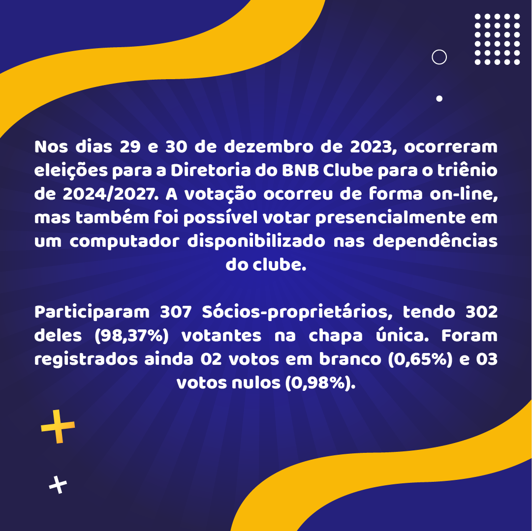 Nos dias 29 e 30 de novembro de 2023, ocorreram eleições para a Diretoria do BNB Clube para o triênio de 2024/2027. A votação ocorreu de forma on-line, mas também foi possível votar presencialmente em um computador disponibilizado nas dependências do clube.