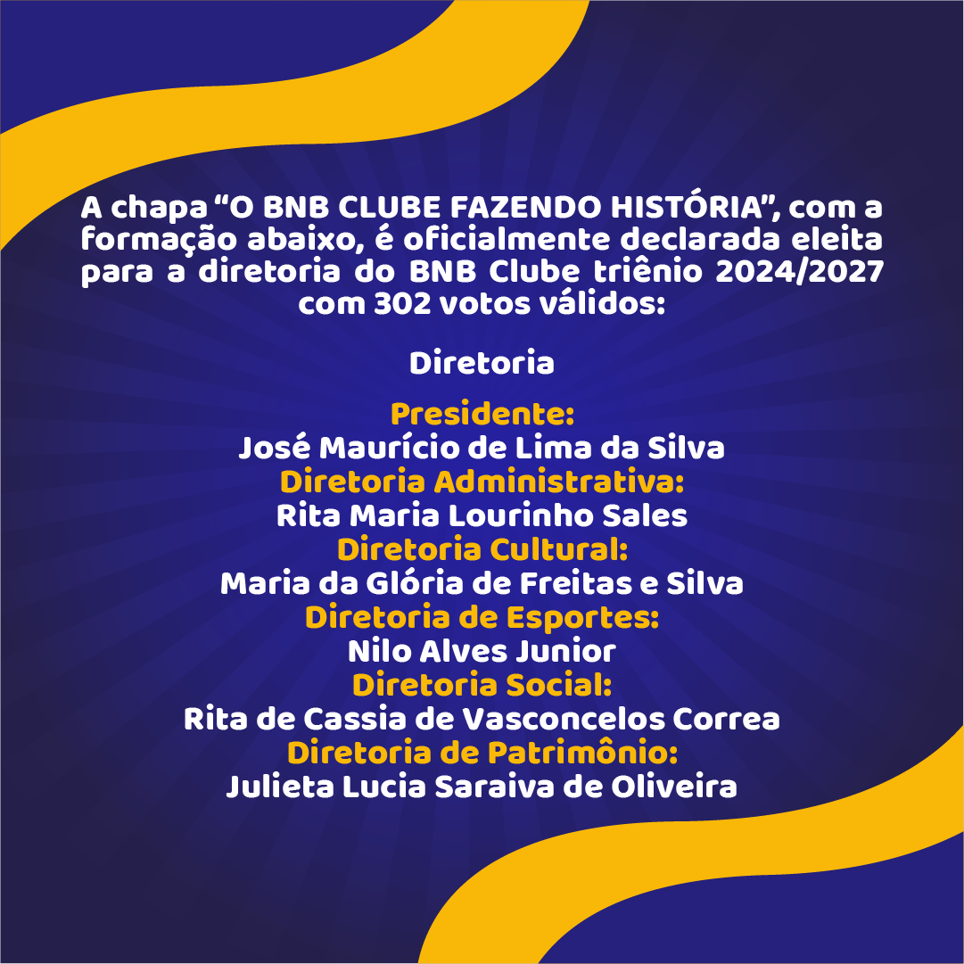 oficialmente declarada eleita para a diretoria do BNB Clube triênio 2024/2027 com 302 votos válidos: