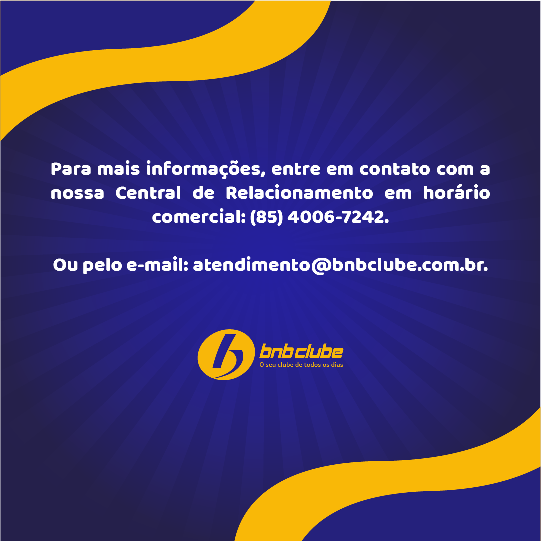 Para mais informações, entre em contato com a nossa Central de Relacionamento em horário comercial: (85) 4006-7242 ou pelo e-mail: atendimento@bnbclube.com.br