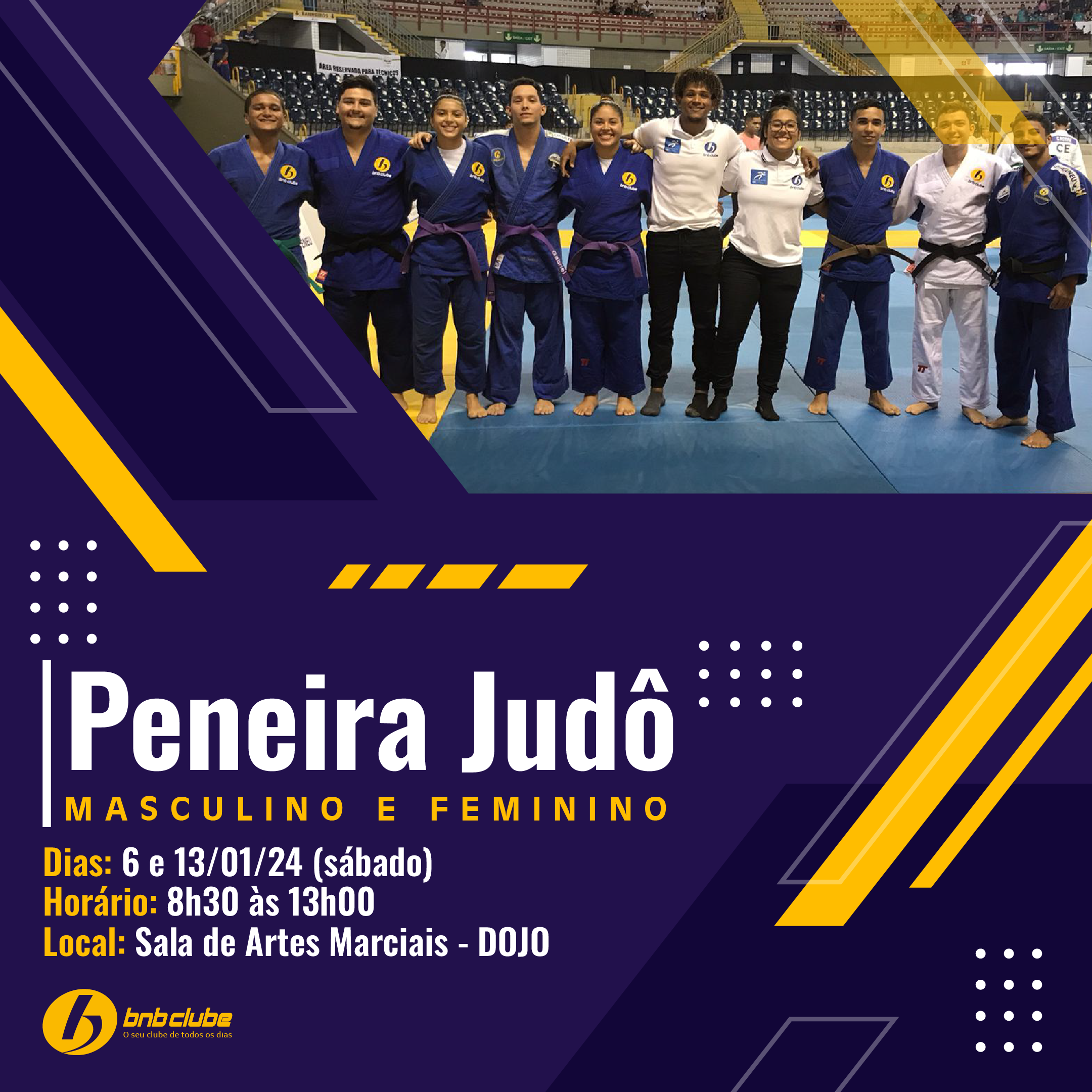 Os testes serão realizados na Sala de Artes Marciais, nosso querido Dojo. E o atleta deve comparecer com kimonos da cor branca ou azul.